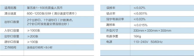 具有清分,鉴伪,计数计值等多项功能,根据用户要求,任意设置流通币挑残,ATM配钞,多面值清分等多种清分方式和不同出钞方案。立式走钞结构设计,体积小,重量轻,噪音小,独特的防尘结构设计,适合不同场所的纸币清分要求。