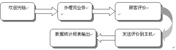 整个系统由前台评价设备、无线通讯控制器及服务端的网点统计监控软件和评价管理软件组成。系统实现功能的流程: